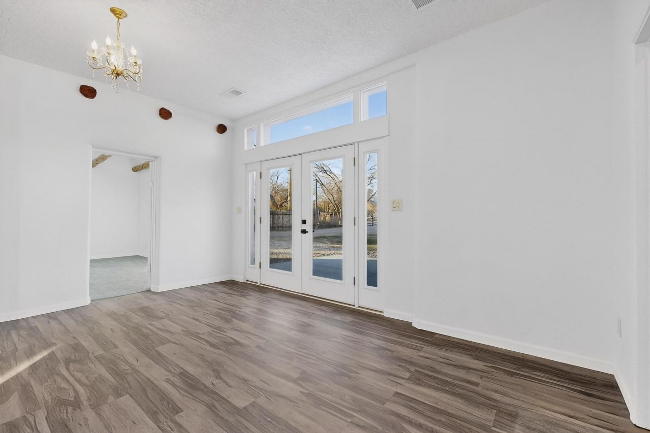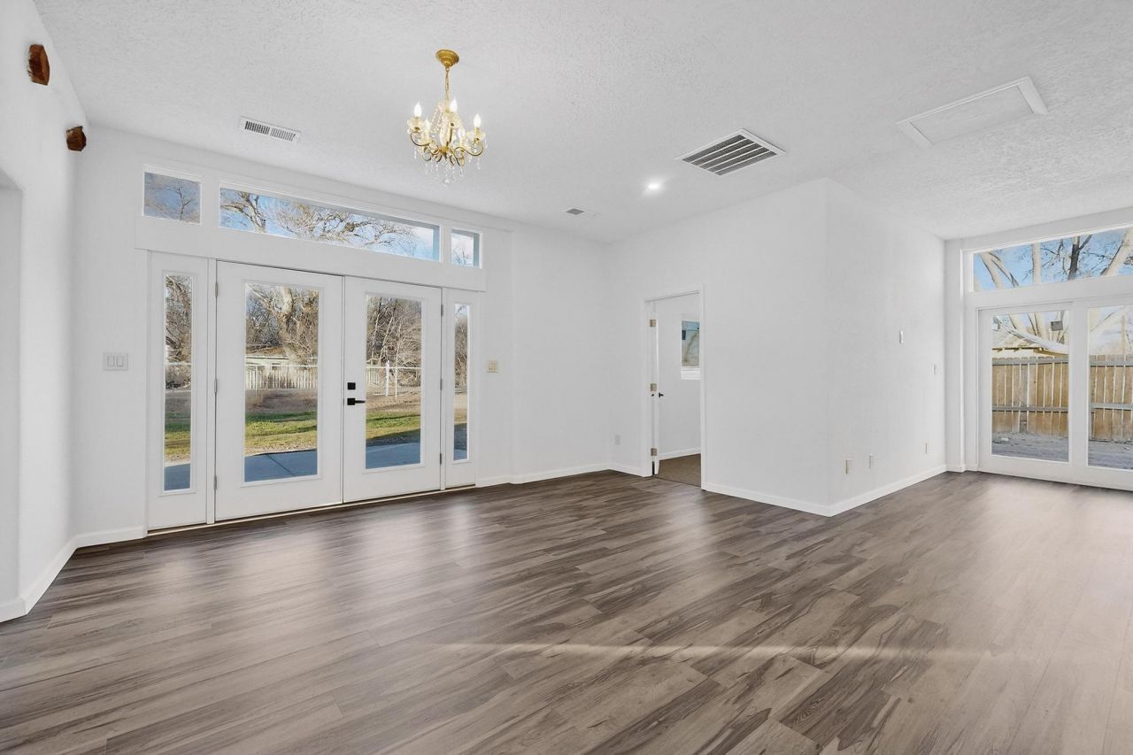 Beautifully remodeled home on a quiet dead-end street near the bosque. Open floor plan with 3 bedrooms plus a front office or flex room. Spacious primary suite features a large bath with walk-in shower and garden tub (shower glass ordered and to be installed).Extensive updates since mid-2025 include a new metal roof, electrical, plumbing, cabinets, appliances, flooring, fixtures, windows, doors, on-demand water heater, HVAC system, and stucco. Situated on nearly a 1/2-acre lot with ample space for a garage, workshop, or additional dwelling. Ideal for entertaining or enjoying a peaceful setting.Great area for RV parking with a complete pull around available.