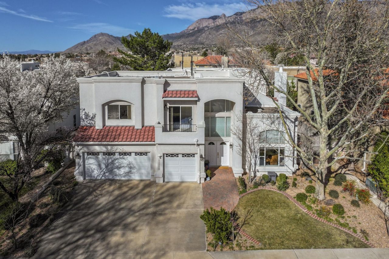 Nestled beneath the Sandia Mountains, Tanoan East offers a rare lifestyle within Albuquerque's only 24/7 guard-gated golf course community and is the enclave that hosts the Tanoan Country Club. Residents enjoy tree-lined fairways, manicured greens, rolling hills, and tranquil ponds set among beautifully maintained grounds. Optional Country Club membership provides access to championship golf, tennis, swimming, fitness facilities, and upscale dining--bringing resort-style living home.Designed to inspire, this distinctive residence showcases refined architectural elements including graceful curved walls, clerestory windows, and a dramatic sweeping staircase. Abundant windows and skylights flood the home with natural light, creating bright, inviting interiors throughout.