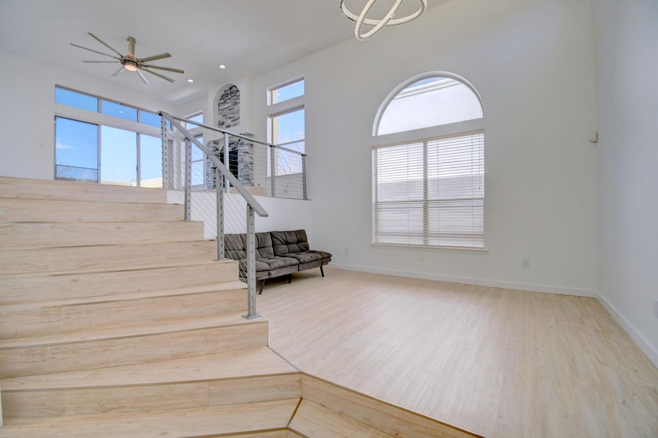 Exquisite home near the Sandia Mountains. 3bed, 3bath, tri-level home offers privacy with a spacious floorplan. A grand entry welcomes you with soaring ceilings, gorgeous LED lighting, and ceiling fans throughout. Two possible living areas centered around a custom stone fireplace, lots of windows fill the home with natural light. Step onto the balcony to enjoy sunsets and sparkling city views. The designer kitchen is a true showpiece, featuring quartz countertops, an elegant apron-front sink, and custom wood cabinetry crafted by McCoy. The main suite is private with balcony access, a large walk in closet, and a spa-inspired bath complete with a walk-in shower and oversized tub. Luxury vinyl waterproof flooring flows throughout the home.