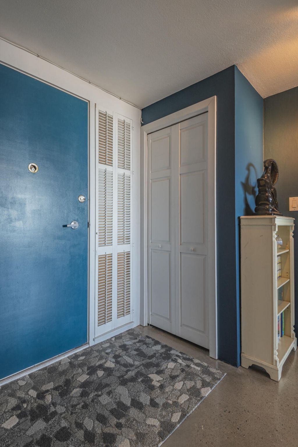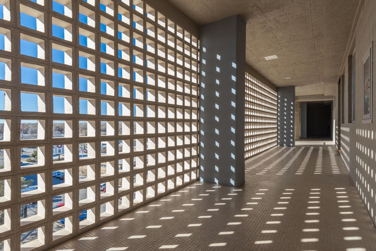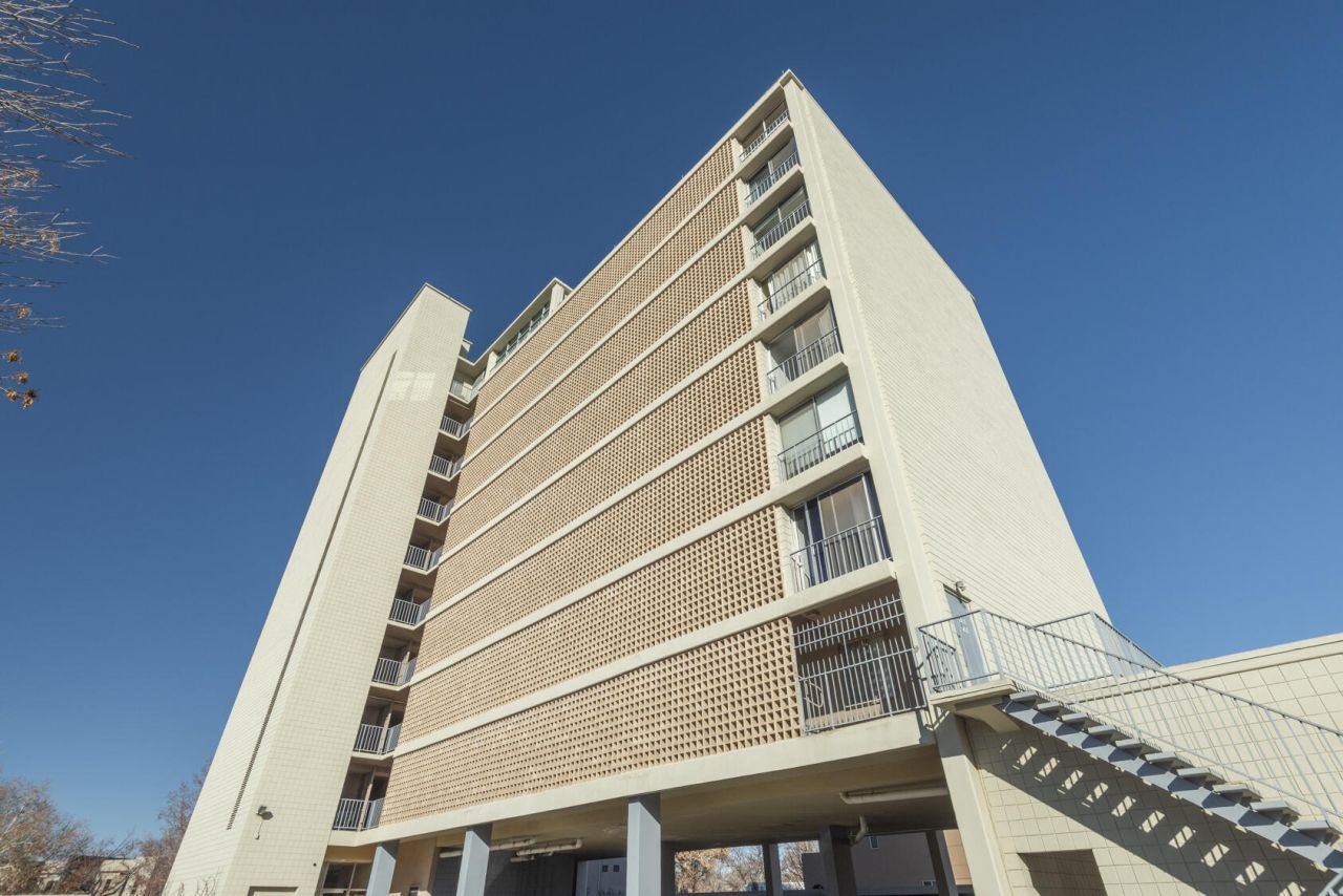 A ''casa in the sky'' at Alcalde, ABQ's landmark contemporary high-rise next to the Country Club! Vertical mid-century modern living at its finest; 1 of just 29 units in the building. Seamlessly blending vintage charm w/modern aesthetic & a color palette in the soothing blue-gray spectrum. Living room opens to deep balcony w/original tile floor + City & Mtn views. Kitchen w/''Juliet'' balcony + black granite counters & original cabinets. Concrete floors throughout keep the vibe sleek & cool. High end custom blinds. Spacious bedroom with great storage. Full bath strikes a ''Scandinavian'' note w/wood door & vanity. Study/office could be 2nd bedroom. Refrig AC, stacked W/D, elevator service, community pool & covered parking. Enjoy life ''above it all'' in an outstanding Downtown location!